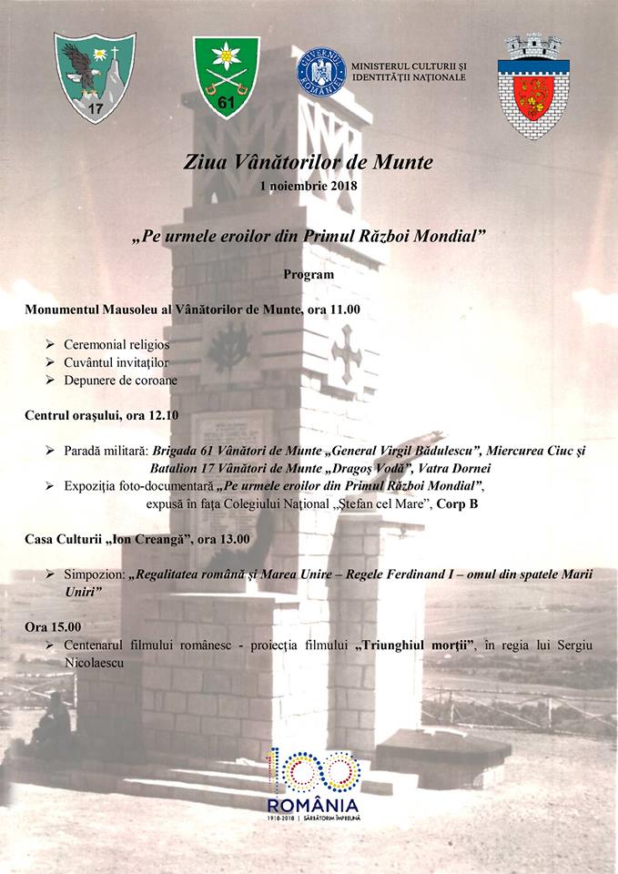 Ziua Vanatorilor de Munte va fi comemorata in Anul Centenarului printr-o serie de activitati ce se vor desfasura la Monumentul Vanatorilor de Munte – ceremonie religioasa,depuneri de coroane, in Centrul orasului – parada militara si Casa Culturii Ion Creanga – simpozion si proiectie film.