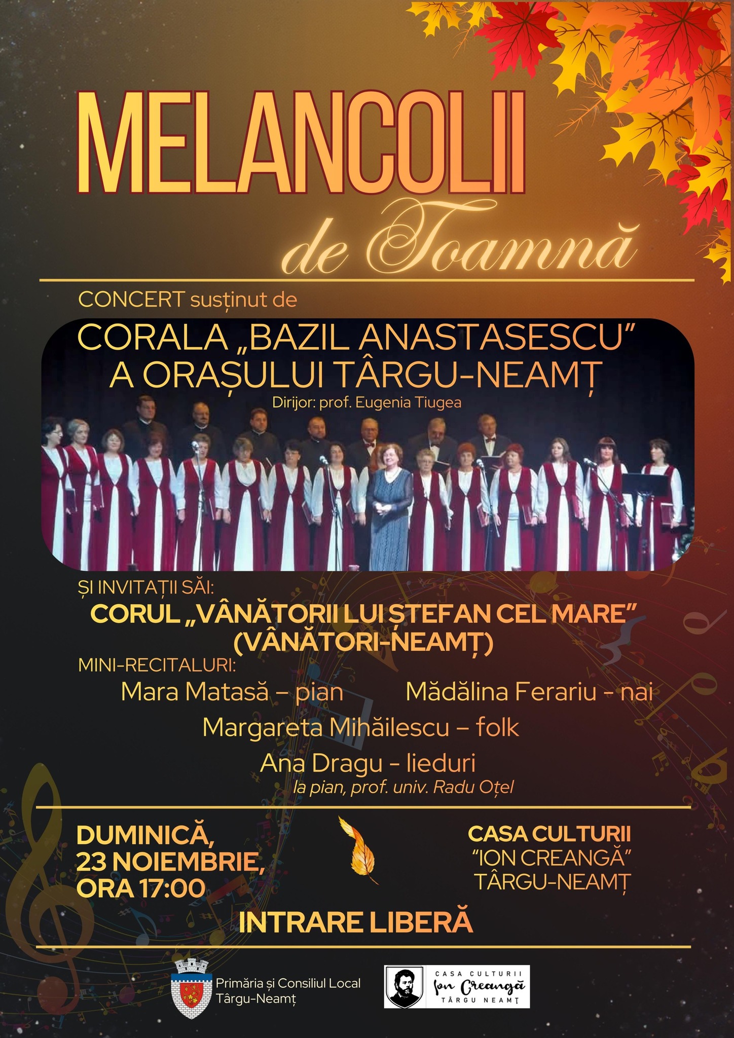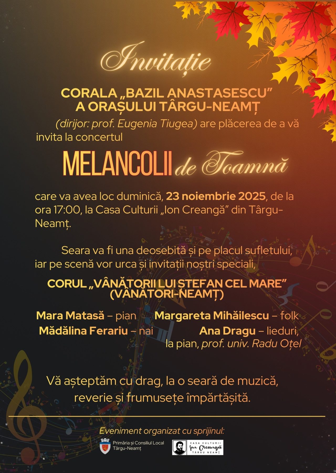 Vă așteptăm să vă părăsiți zilnicul și să vă lăsați cuiburți de emoțiile unei anotimpuri pline de farmec! Corala „Bazil Anastascescu” a orașului Târgu-Neamț, sub bagheta dirijorului prof. Eugenia Tiugea, vă invită la spectacolul „MELANCOLII DE TOAMNĂ”.
