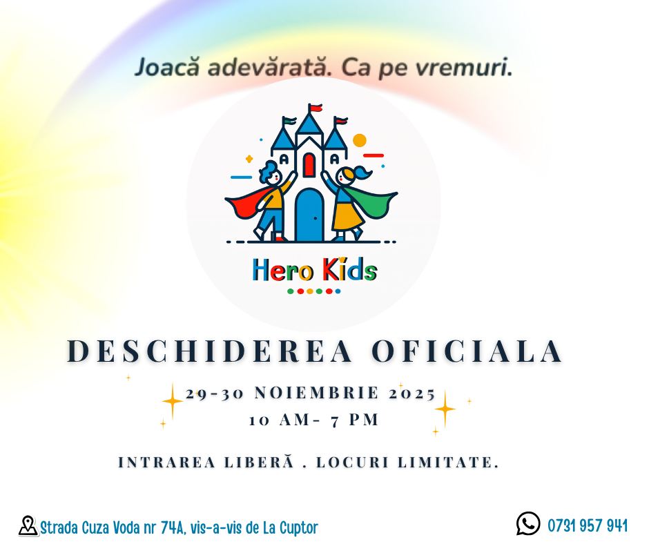 Pe 29 și 30 noiembrie deschidem oficial porțile Hero Kids – un loc de joacă bine gândit, dotat special pentru ca cei mici si mari sa fie in siguranta!