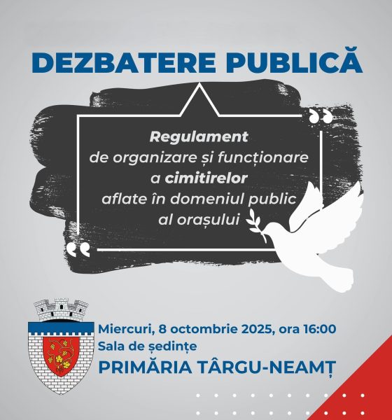 Miercuri, 8 octombrie 2025, ora 16:00, locuitorii orașului Târgu-Neamț sunt invitați la dezbatarea publică privind Proiectul de hotărâre pentru aprobarea...