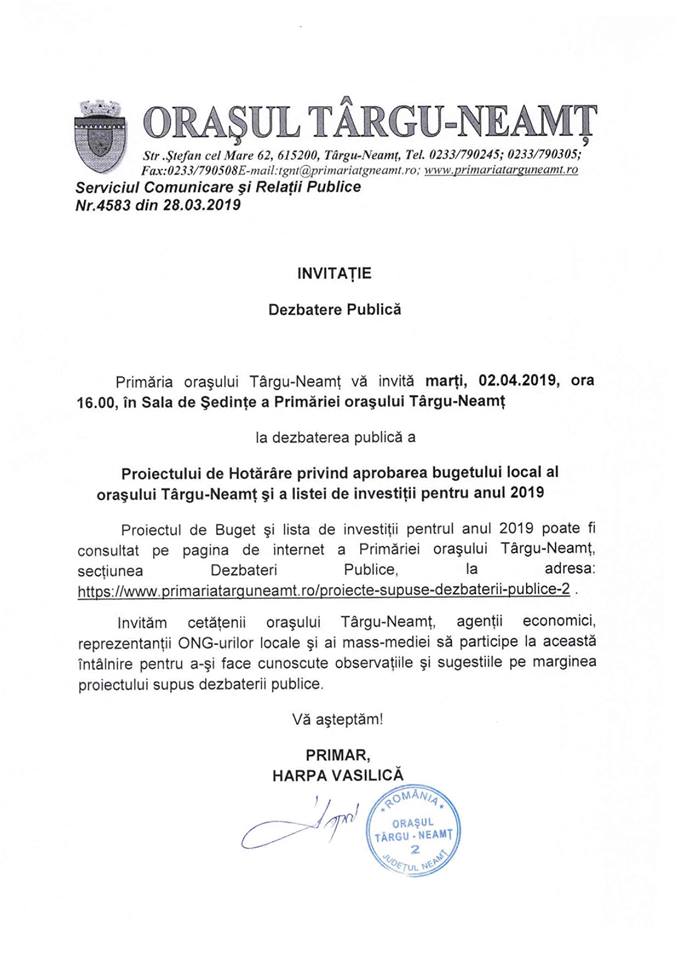 Invităm cetățenii orașului, agenții economici de pe rază orașului Târgu–Neamț și reprezentanți ai ONG-urilor locale să participe la dezbaterea publică a Bugetului local și a listei de investiții pentru anul 2019 ce va avea loc marți, 2 aprilie 2019, în Sala de Ședințe a Primăriei orașului Târgu–Neamț. Persoanele interesate pot consulta proiectul pe pagina de internet a instituției la secțiunea Dezbateri Publice https://www.primariatarguneamt.ro/proiecte-supuse-dezbaterii-publice-2 sau la Biroul 5 – Relații Publice. De asemenea, pot fi transmise propuneri, sugestii ce vor fi discutate în cadrul dezbaterii publice.