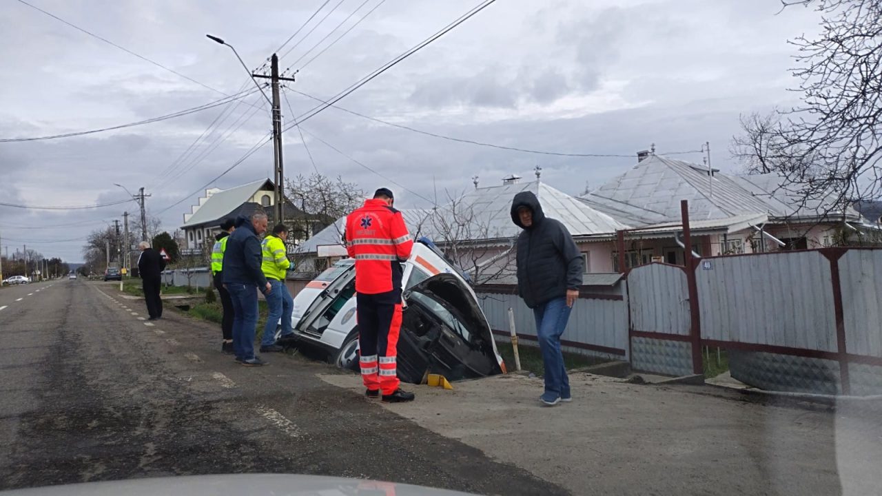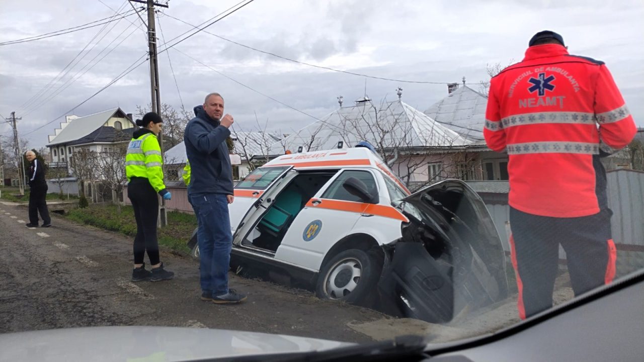 O ambulanță a ajuns într-un șanț și s-a izbit de un cap de pod