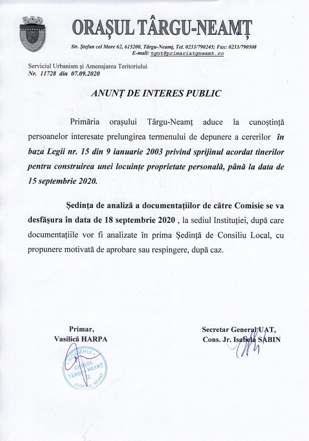 Noul termen pentru depunerea cererilor este de 15 septembrie 2020. Ședința de analiză a documentațiilor de către Comisie se va desfășura în data de 18 septembrie 2020, la sediul Instituției, după care documentațiile vor fi analizate în prima Ședință de Consiliu Local, cu propunere motivată de aprobare sau respingere, după caz.