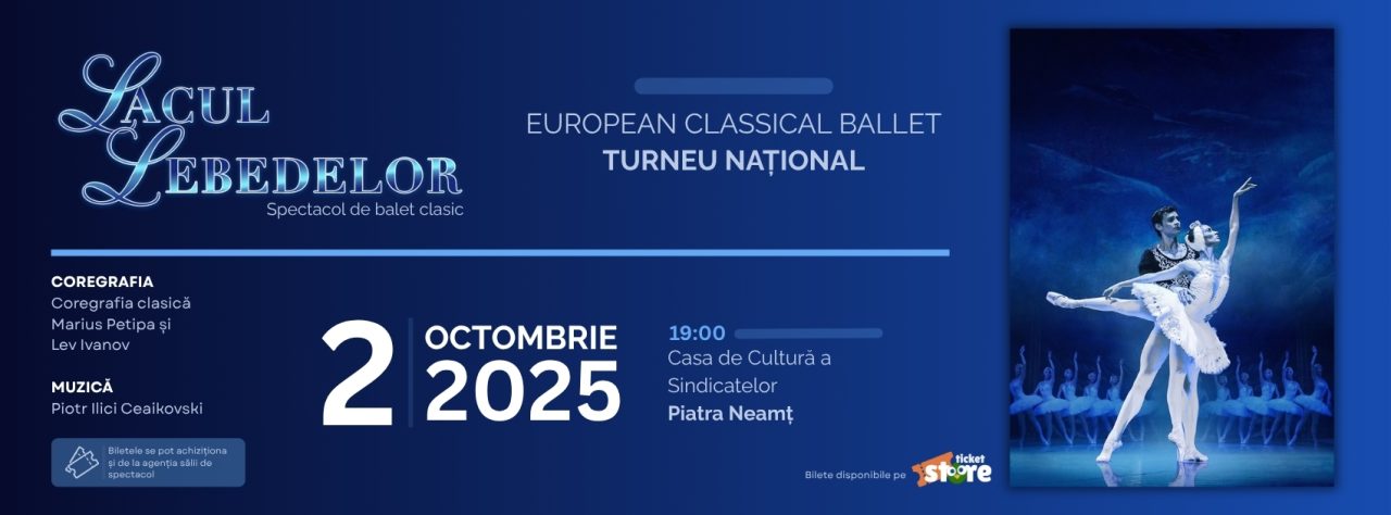 Piatra-Neamț, 22 septembrie 2025 – Pe 2 octombrie 2025, de la ora 19.00, Casa de Cultură a Sindicatelor din Piatra-Neamț va găzdui unul dintre cele mai îndrăgite spectacole de balet din lume: „Lacul Lebedelor“, prezentat de prestigioasa companie European Classical Ballet în cadrul turneului național 2025.